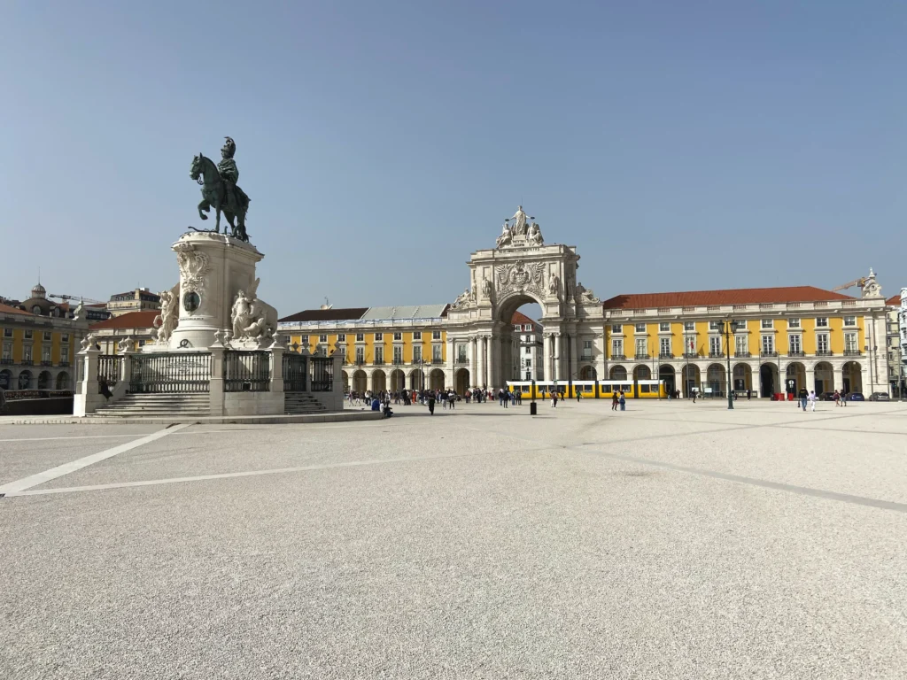 Der Praca do Comercio zählt mit zu den schönsten Plätzen Europas. Richtung Süden steht er an der auffallenden Flussmündung des Tejo offen.