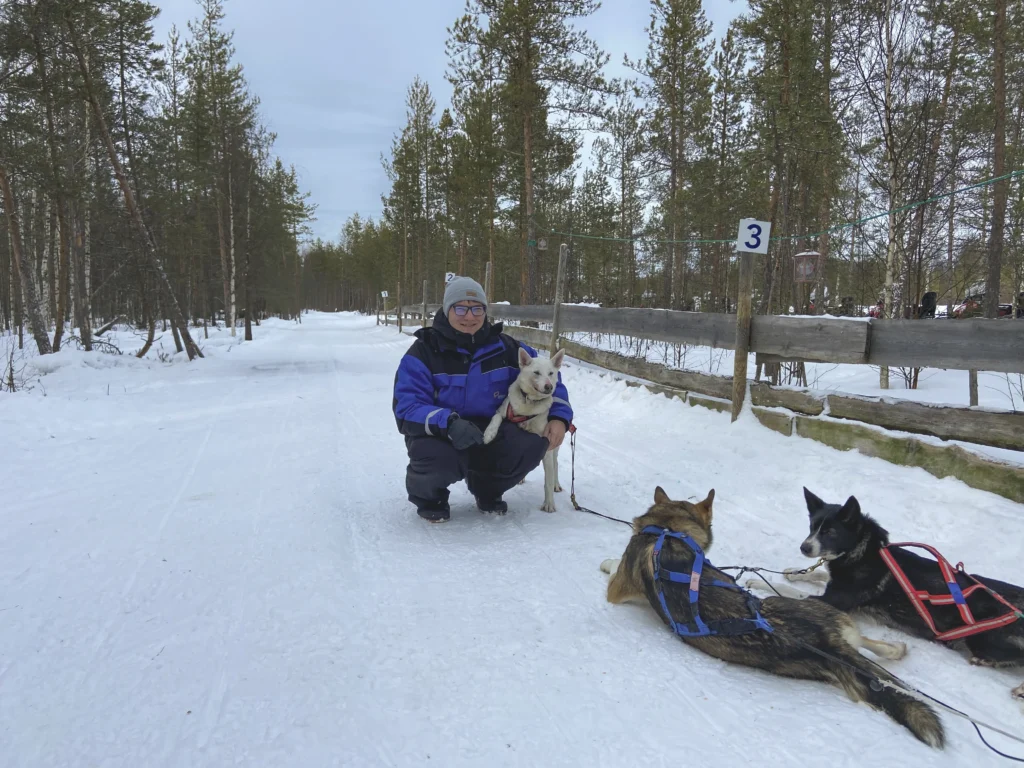 Was wir in Finnisch Lappland unbedingt machen wollten, war eine Husky-Tour. Es gibt viele Anbieter. Es war auf jeden Fall ein tolles Erlebnis. Die Gruppe bestand aus fünf bis sechs Pärchen, die jeweils einen Schlitten mit fünf Huskys fuhren. Dabei fährt eine Person den Schlitten und die andere sitzt vorne und kann die winterliche Landschaft genießen. Nach der halben Strecke wird gewechselt. Die Huskys sind wirklich schnell. Wenn wir anhalten sollten, musste ich mich mit meinem gesamten Gewicht auf den Schlitten stellen, ansonsten wären die Huskys weiter gerannt und der Schlitten hätte wohl nicht angehalten.